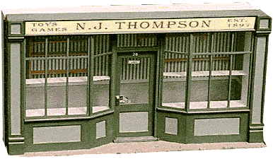 Very useful is this little shop. Being narrow from front to back, it is ideally suited for hanging on a wall or standing on a bookshelf. The front swings out and there is ample display area both on the window and rear wall shelves